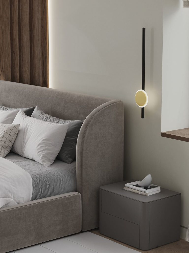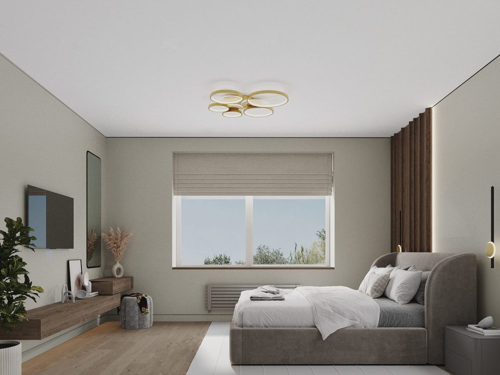 В основе интерьера — нейтральная палитра и мягкие текстуры. Центр комнаты занимает широкая кровать с изголовьем обтекаемой формы, рядом — лаконичные прикроватные тумбы и подвесные светильники в виде вытянутых линий с круглым акцентом. Всё это создаёт ощущение лёгкости и современности. У окна — кресло для отдыха, которое вместе с журнальным столиком образует маленький уголок для чтения.