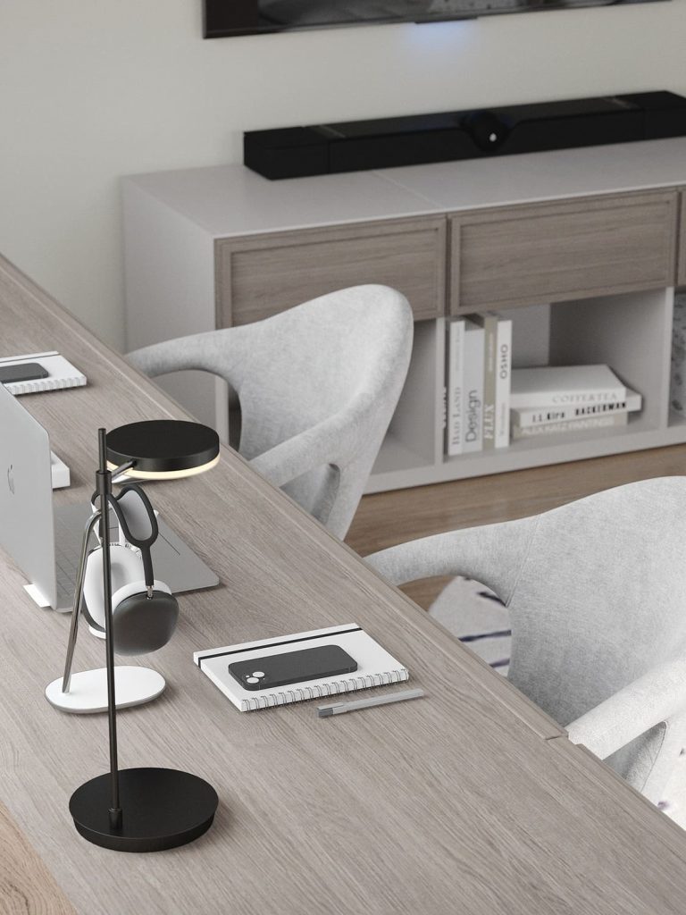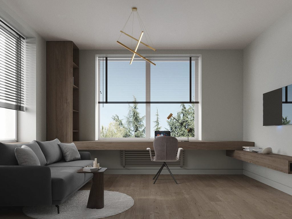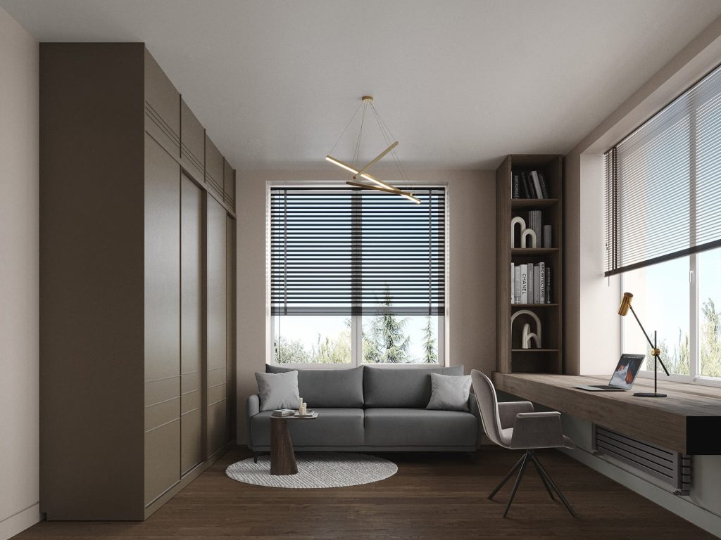 У окна расположена рабочая зона с длинной деревянной столешницей, которая органично встроена в пространство и позволяет использовать комнату и как кабинет. Лаконичное кресло и светильник с золотистым акцентом делают рабочее место стильным и удобным.
