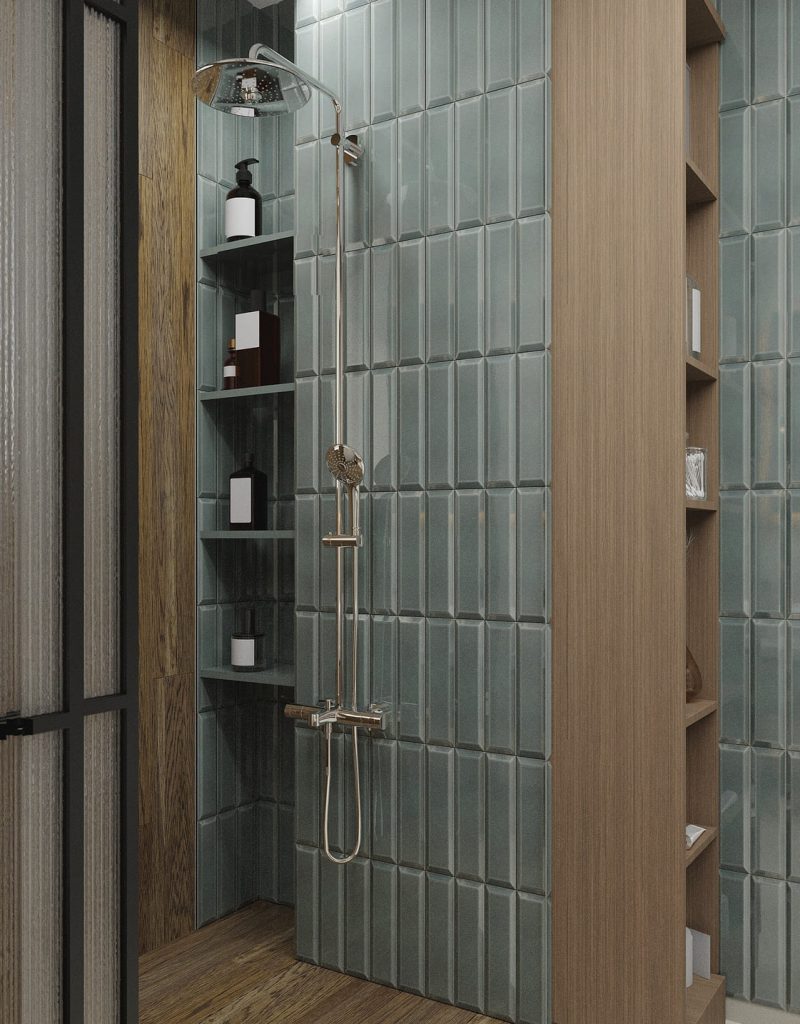 Пространство разделено на зоны: душевая отделена перегородкой из матового стекла с чёрным каркасом, что создаёт ощущение приватности и добавляет графичности интерьеру. Стены оформлены плиткой глубокого зелёного оттенка с фактурной поверхностью, которая красиво играет при разном освещении.