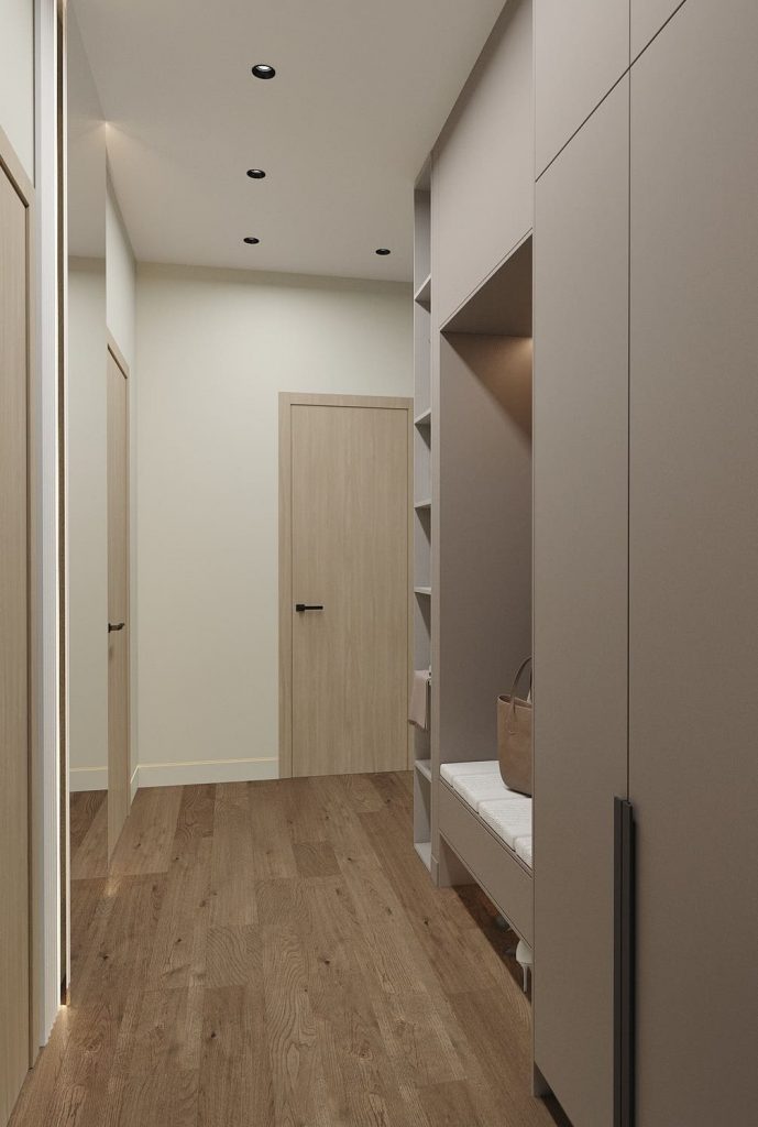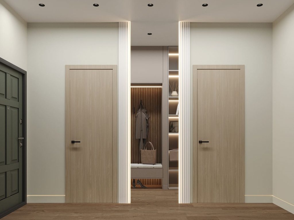 Светлые деревянные двери и мягкая палитра стен визуально расширяют пространство, а аккуратные чёрные ручки и споты на потолке добавляют современного ритма. Благодаря скрытым системам хранения прихожая остаётся максимально чистой и организованной — всё лишнее спрятано за фасадами, а на виду остаётся только спокойная геометрия и натуральные оттенки.