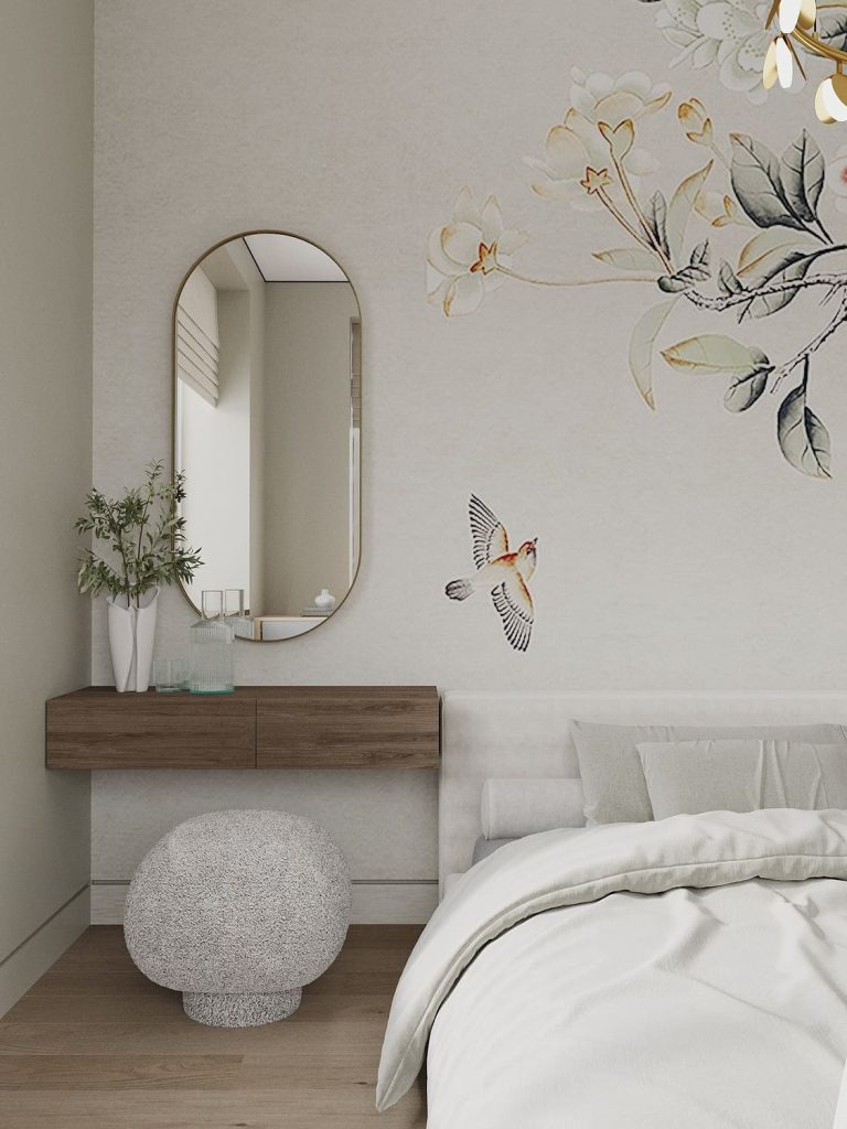 Главный акцент — стена с нежными флоральными орнаментами и изображением птиц. Она задаёт особое настроение, наполняет комнату ощущением свежести и лёгкой поэзии. Светлый текстиль и мягкое изголовье кровати поддерживают атмосферу уюта, а округлые формы мебели добавляют интерьеру пластичности и тепла.