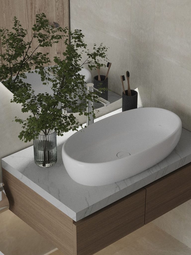 Главный декоративный элемент — большое круглое зеркало с мягкой подсветкой, которое не только визуально расширяет пространство, но и создаёт особое настроение. Под ним расположена подвесная тумба с раковиной овальной формы и столешницей под камень — лаконичное и стильное решение, подчёркивающее общий характер интерьера.