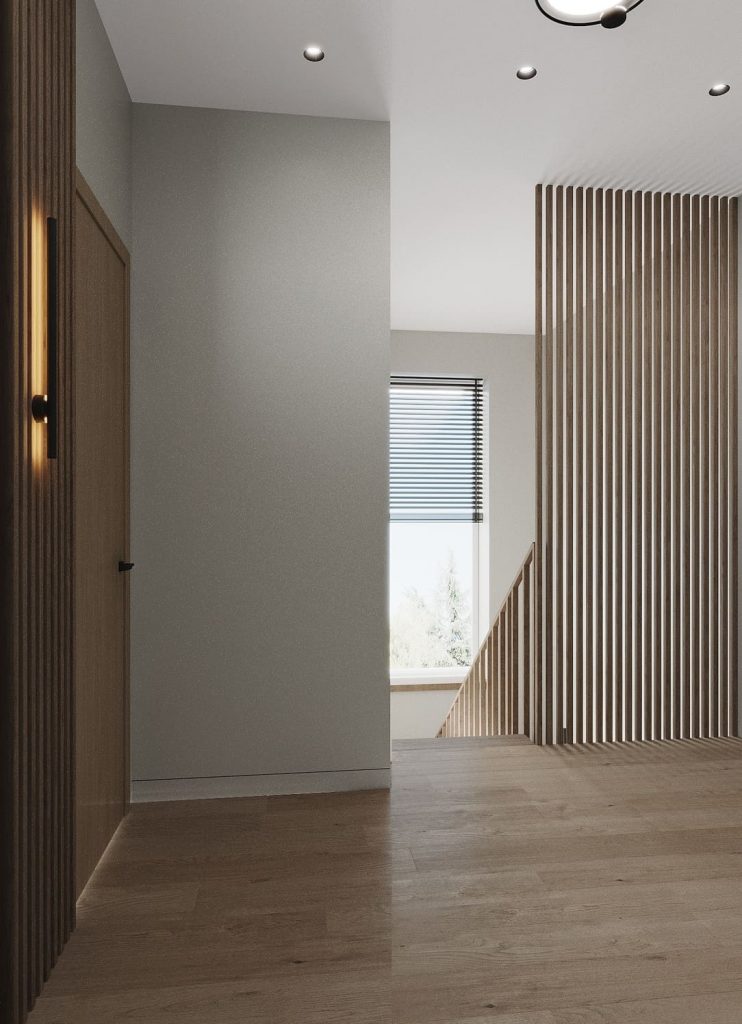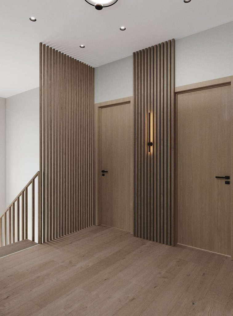 Главным акцентом стали деревянные рейки, которые разделяют зоны и формируют лёгкий ритм в интерьере. Они не только визуально украшают холл, но и добавляют ощущение приватности, мягко отделяя лестницу от жилой части этажа. Светлые стены и пол из натурального дерева делают пространство тёплым и воздушным. Лаконичные двери без лишнего декора подчёркивают минимализм, а встроенные светильники и вертикальный бра на стене создают мягкую атмосферу в вечернее время.