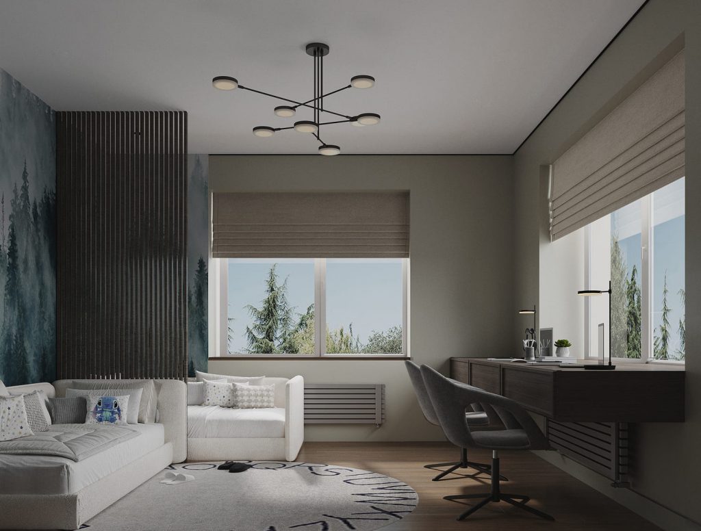 Большое рабочее место у окна рассчитано на двоих: длинный стол и удобные кресла делают процесс учёбы или творчества комфортным. Окна наполняют пространство светом, а тёплые римские шторы помогают регулировать освещение.