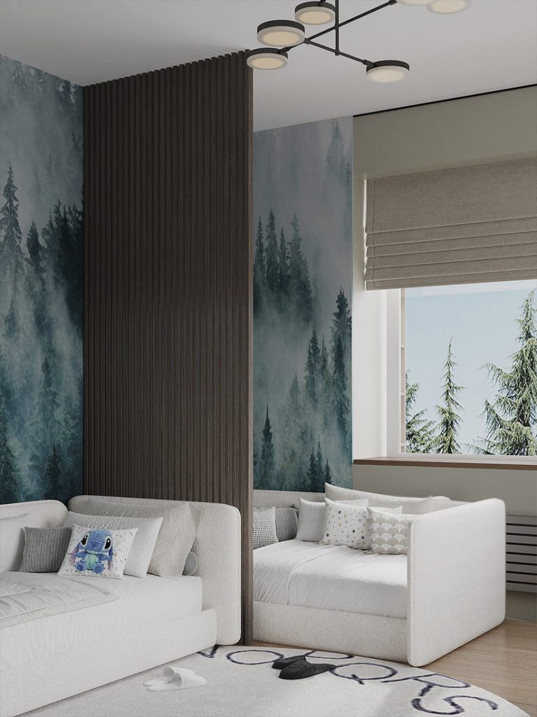 Главный акцент — фотообои с туманным лесом, которые создают атмосферу загадочности и будто переносят в природу. Это решение добавляет глубины пространству и превращает комнату в место для игр и воображения. Мягкие белые диваны-кровати разделены деревянной перегородкой, что позволяет организовать два отдельных уголка для отдыха или сна.