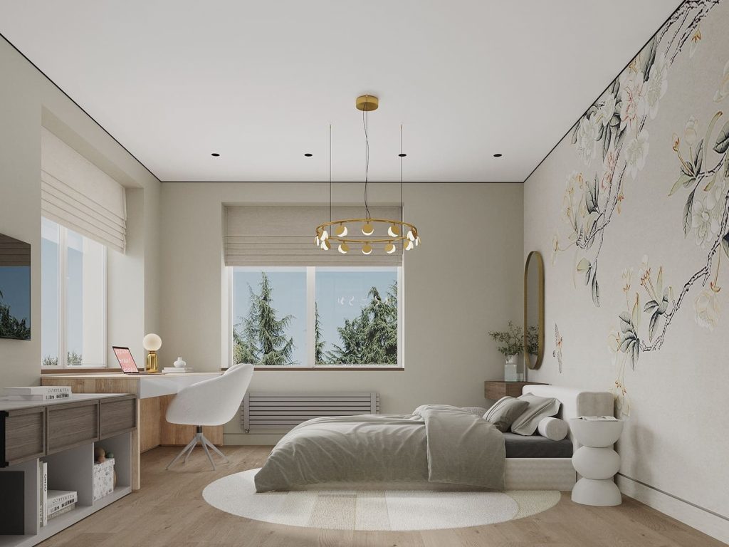 В комнате продумана и рабочая зона: удобный стол у окна позволяет заниматься делами при естественном свете. Лаконичные элементы декора — зеркало в изящной раме, графичная люстра, небольшие тумбы — создают баланс между эстетикой и практичностью.