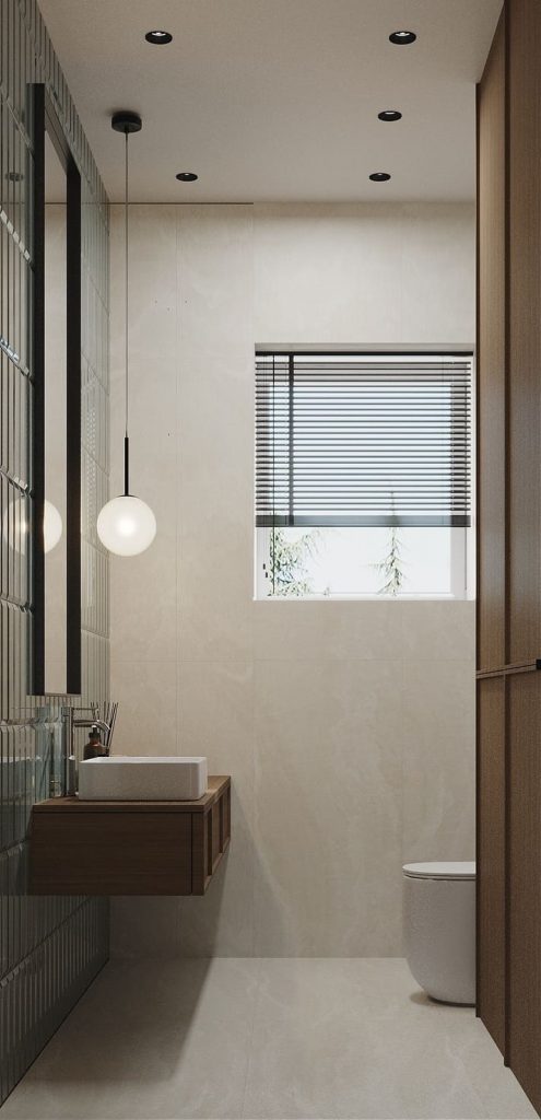 Белая квадратная раковина, большое вертикальное зеркало и подвесной шарообразный светильник создают современный акцент. Декоративные аксессуары в золотистом подносе добавляют уюта, а скрытая подсветка подчёркивает чистоту линий. Компактный унитаз и эргономичная планировка делают санузел удобным для гостей.