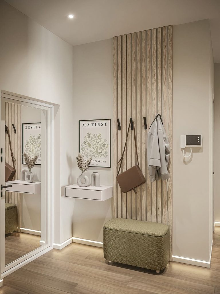 Для хранения верхней одежды предусмотрены аккуратные чёрные крючки, встроенные в декоративную рейку, а под ними — обитый тканью зелёный пуф, который выступает не только как удобное место для переобувания, но и как первый цветовой акцент в интерьере. Рядом — небольшая подвесная консоль с декором, подчёркивающим стиль заказчиков: минимализм, но с характером.