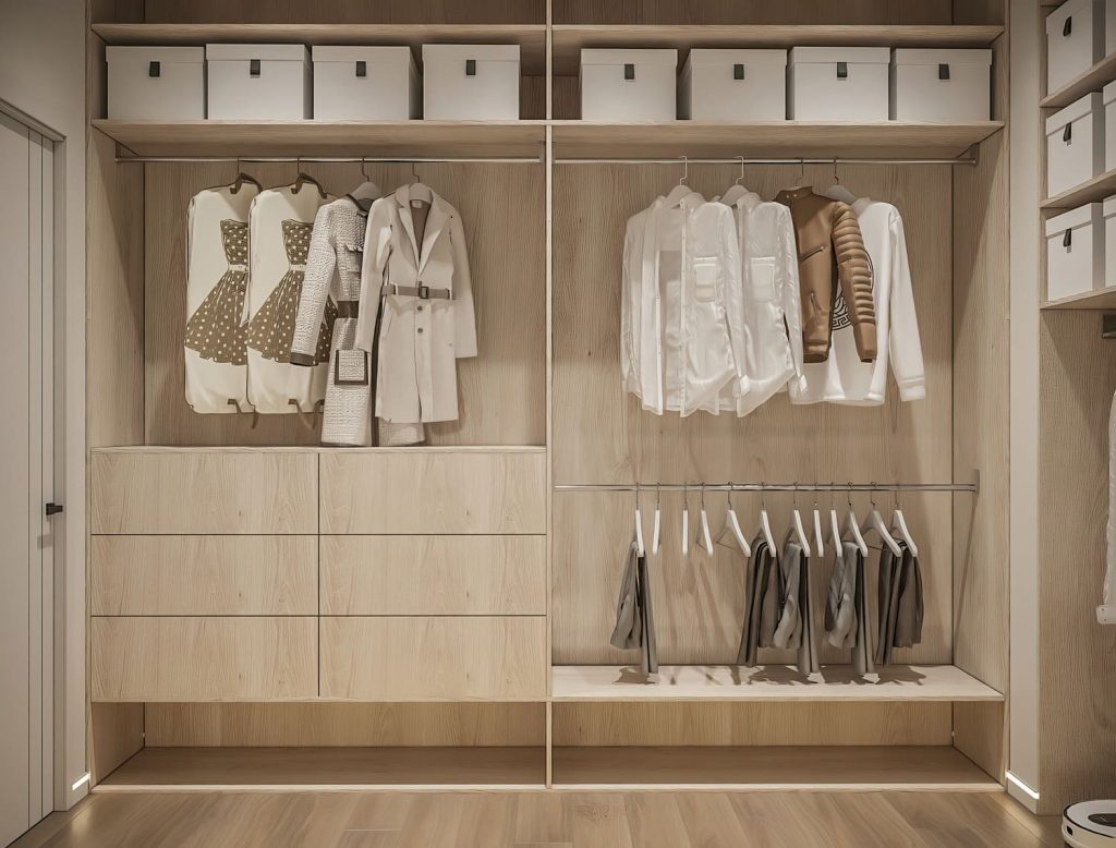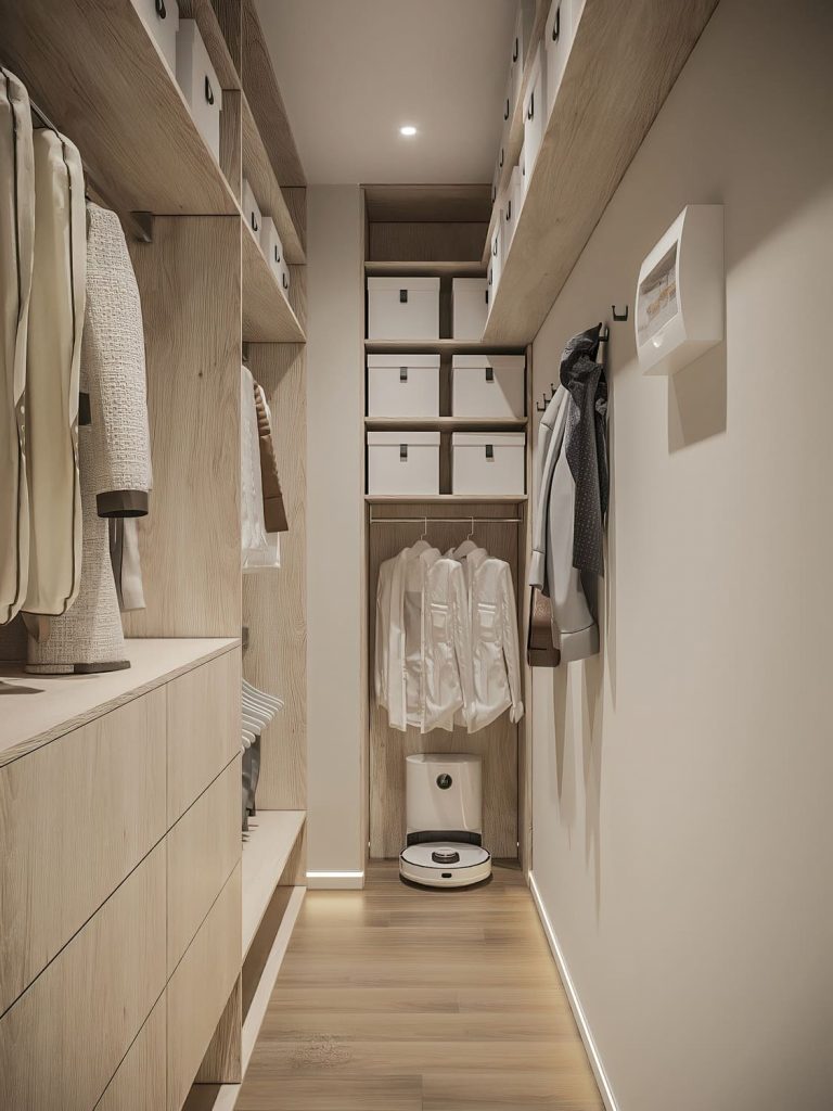 Удобная и компактная гардеробная, где на виду — только порядок. Все системы хранения продуманы до мелочей: открытые полки, закрытые ящики, верхние короба и разные уровни вешалок — для длинной одежды, рубашек и даже детских вещей. В отделке использовано светлое дерево, которое визуально расширяет пространство и делает его тёплым. Подсветка по плинтусу добавляет уюта и помогает легко ориентироваться даже ночью. Здесь есть место для всего: одежды, обуви, аксессуаров, техники и даже робота-пылесоса с базой.