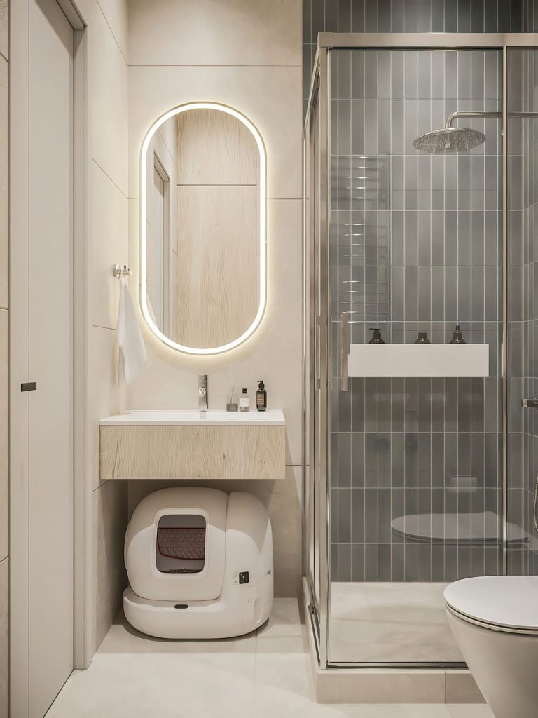 Главный плюс этой комнаты — функциональность на каждый сантиметр. Здесь удобно расположились и душ с верхней лейкой, и компактная подвесная раковина, под которой нашлось место даже для автоматизированного туалета для питомца — приятная мелочь, которая говорит о заботе о всей семье.