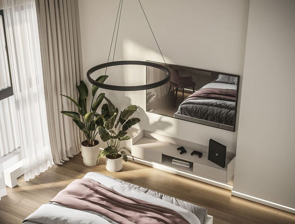 Напротив кровати — тумба с телевизором и декоративными элементами, а у окна — живые растения, которые оживляют интерьер и делают его ближе к природе.