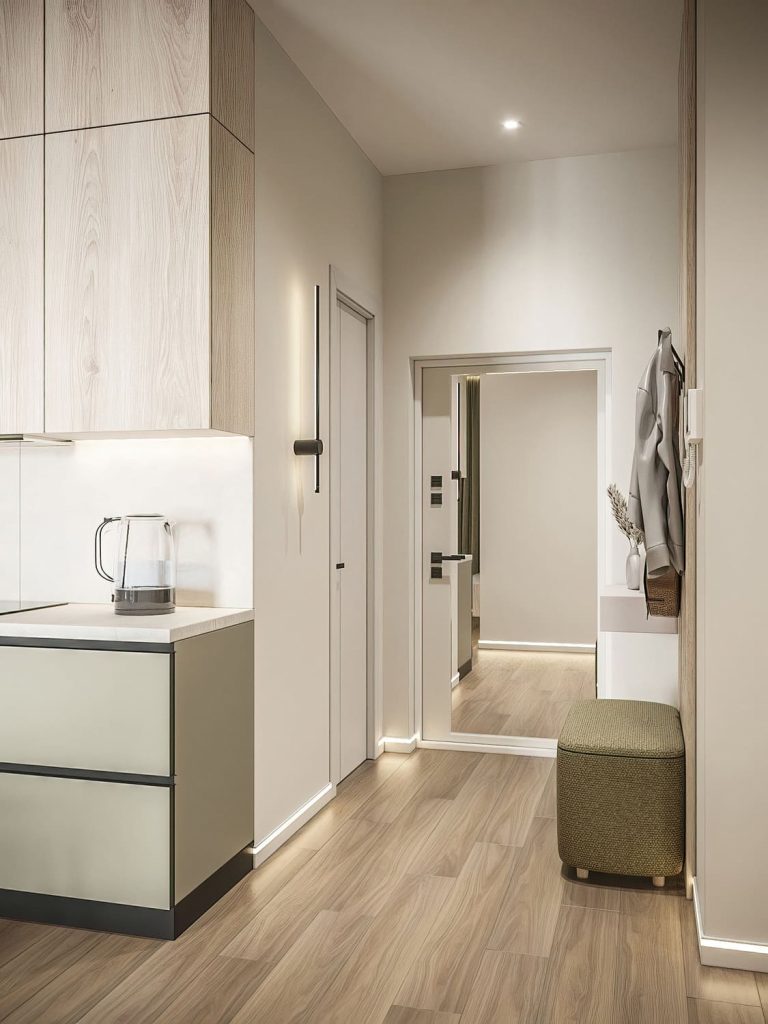 Это интерьер двухкомнатной квартиры, созданный для молодой семьи, которая ценит простоту, функциональность и утонченную эстетику. Основной запрос от заказчиков — минимализм в светлых тонах без перегруза декором, но с грамотными цветовыми акцентами, которые добавят характер и настроение.