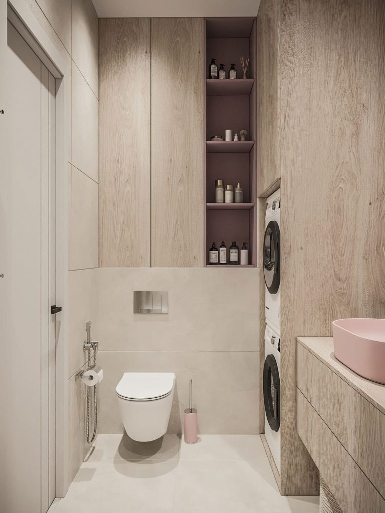 Все элементы встроены и визуально чисты: инсталляция унитаза, скрытые системы хранения в отделке под дерево, сантехника без лишней декоративности. Благодаря минималистичному оформлению и грамотной компоновке, комната не выглядит перегруженной — напротив, она кажется просторной и светлой.