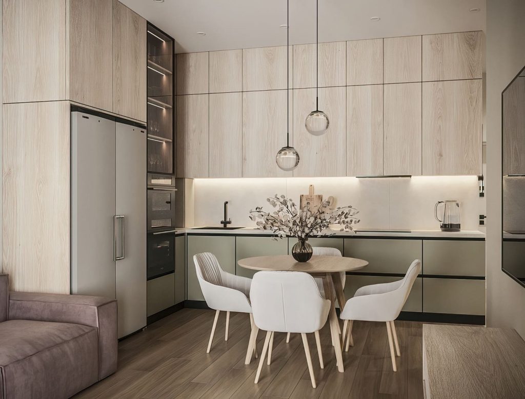 Кухонный гарнитур выполнен в двух оттенках: верхние фасады под светлое дерево визуально «растворяются» в стене, а нижние — в оливковом цвете с чёткой графикой чёрных профилей. Несмотря на минималистичный облик, кухня получилась максимально функциональной: вместительные системы хранения до потолка, встроенные духовой шкаф и микроволновка, вместительный холодильник и продуманная подсветка рабочей зоны делают её удобной и современной.