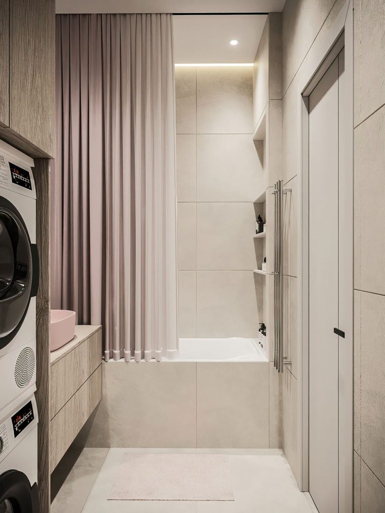 Блок с стиральной и сушильной машинами удачно вписан в нишу и обрамлён шкафами, благодаря чему не выбивается из общей композиции. А зеркало с подсветкой и изогнутой плиточной вставкой добавляет визуальную глубину и делает интерьер особенно выразительным.