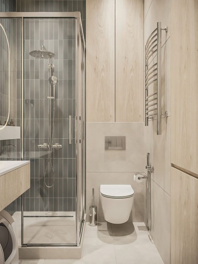 Интерьер выдержан в тех же светлых тонах, но с более акцентным оформлением: стены в душевой зоне облицованы вертикальной тёмно-серой плиткой, которая добавляет глубины и визуально вытягивает пространство вверх.