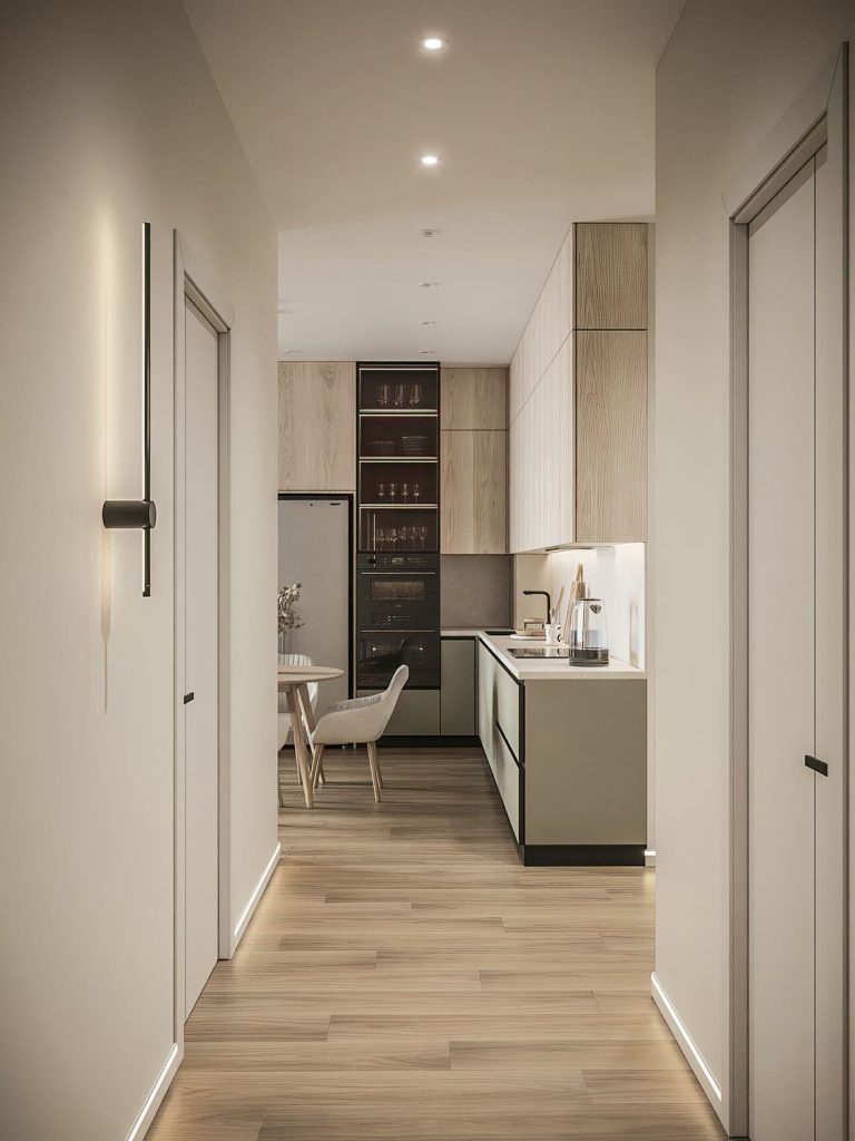 В прихожей светлые стены и дерево с выраженной текстурой создают тёплую, гостеприимную атмосферу, а подсветка по периметру пола визуально расширяет пространство и придаёт ему «парящий» эффект — особенно актуально для узких зон.
