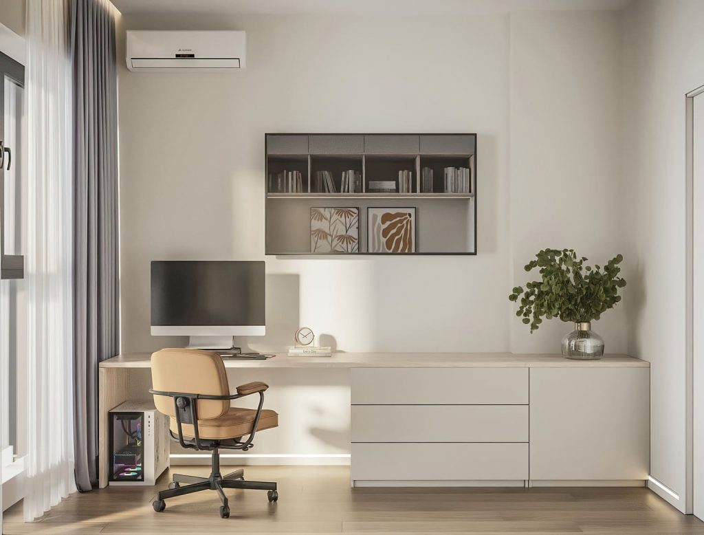 Рабочая зона расположена у окна, где максимум дневного света. Просторный стол, удобное кресло и современный ПК — всё для комфортной работы или учёбы. Над столом — подвесной шкаф с книгами и декором, а по правую руку — вместительный комод для хранения. Вся мебель выдержана в едином стиле: простые формы, нейтральные оттенки, лёгкость линий.
