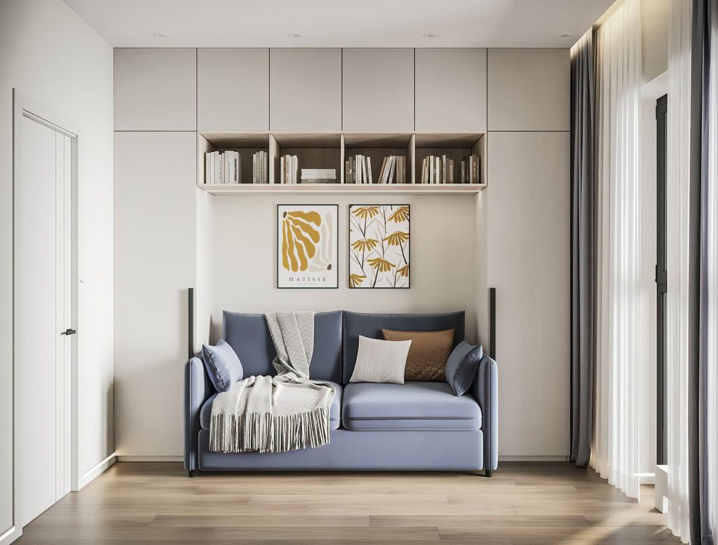 Основной цвет — светлый беж с контрастными деталями. Цветовой акцент — приглушённо-синий диван, который служит и местом для чтения, и полноценным спальным местом. Над диваном — компактная библиотека и открытые полки с книгами и декором, что добавляет уюта. Жёлто-горчичные постеры делают интерьер живее, при этом не перегружая его.