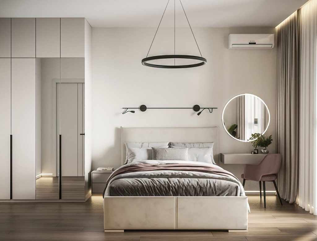 Светлая палитра стен и мебели создаёт ощущение покоя, а розовато-пудровые акценты в текстиле и кресле добавляют женственности и нежности, не нарушая общей строгости минималистичного подхода.