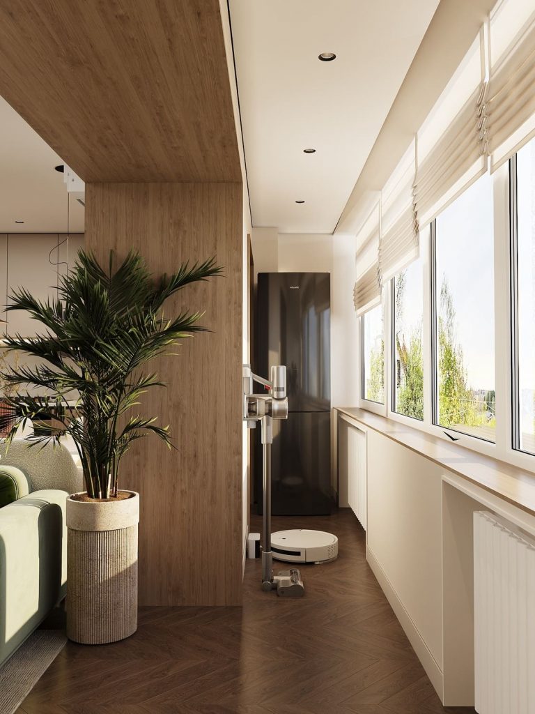 Здесь предусмотрено удобное хранение — встроенный шкаф и открытые полки для сезонных вещей, чемоданов и бытовых мелочей. Благодаря тёплой отделке деревом и большим окнам пространство наполнено светом и выглядит уютно даже в пасмурные дни. Белые римские шторы регулируют уровень освещённости и добавляют уюта, а нейтральная палитра делает балкон универсальным: его можно использовать как зону отдыха, мини-мастерскую или просто место для утреннего кофе.