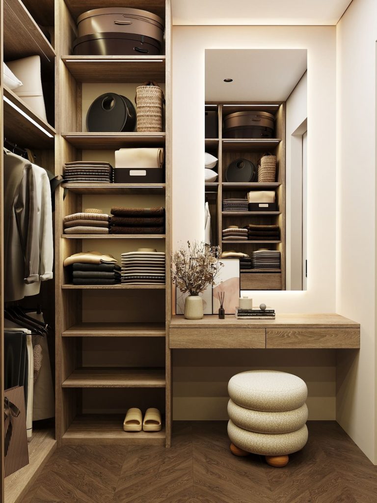 Отдельная зона с туалетным столиком и мягким пуфом превращает гардеробную в личное пространство, где можно спокойно собраться утром или завершить день.