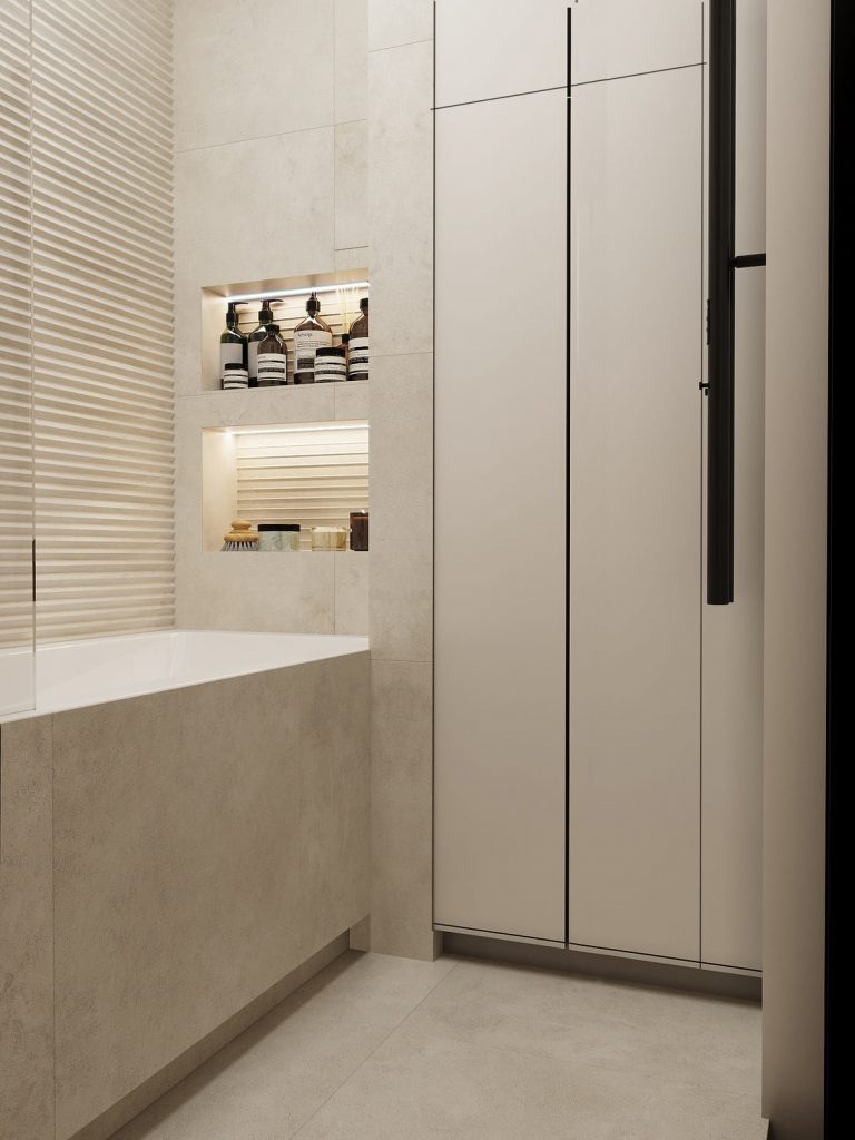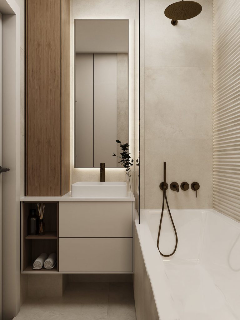 Зона ванны выполнена с акцентом на функциональность и эстетику: встроенные ниши с подсветкой позволяют хранить всё необходимое, а смесители и душ в бронзовом оттенке добавляют интерьеру изысканности.