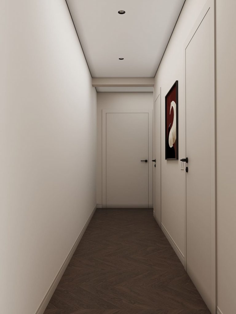 Вдоль коридора — ровные стены и двери с лаконичными наличниками, всё в едином цвете. Чёрные дверные ручки добавляют графики и современности. На одной из стен — картина, которая становится эмоциональной точкой маршрута, связывая нейтральную палитру с акцентами будущих комнат.
