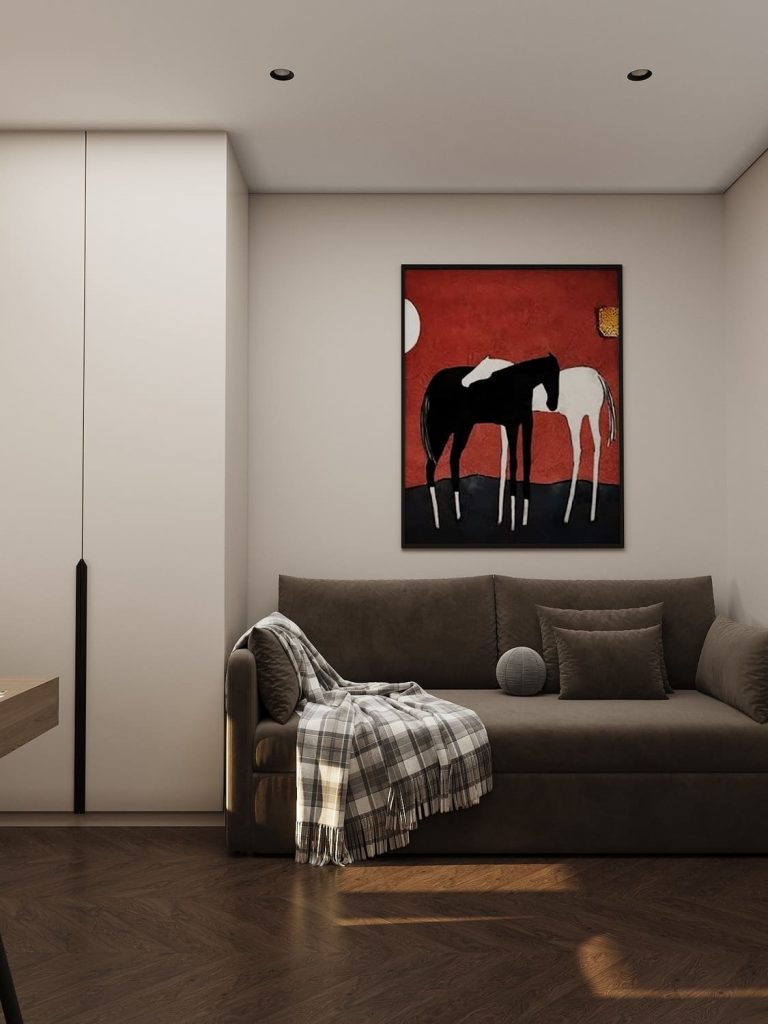 Противоположная стена оформлена лаконично: вместительный шкаф без лишней фурнитуры и картина с контрастным красным фоном — акцент, который оживляет спокойную палитру комнаты. Такое решение делает интерьер не только функциональным, но и эмоционально выразительным.