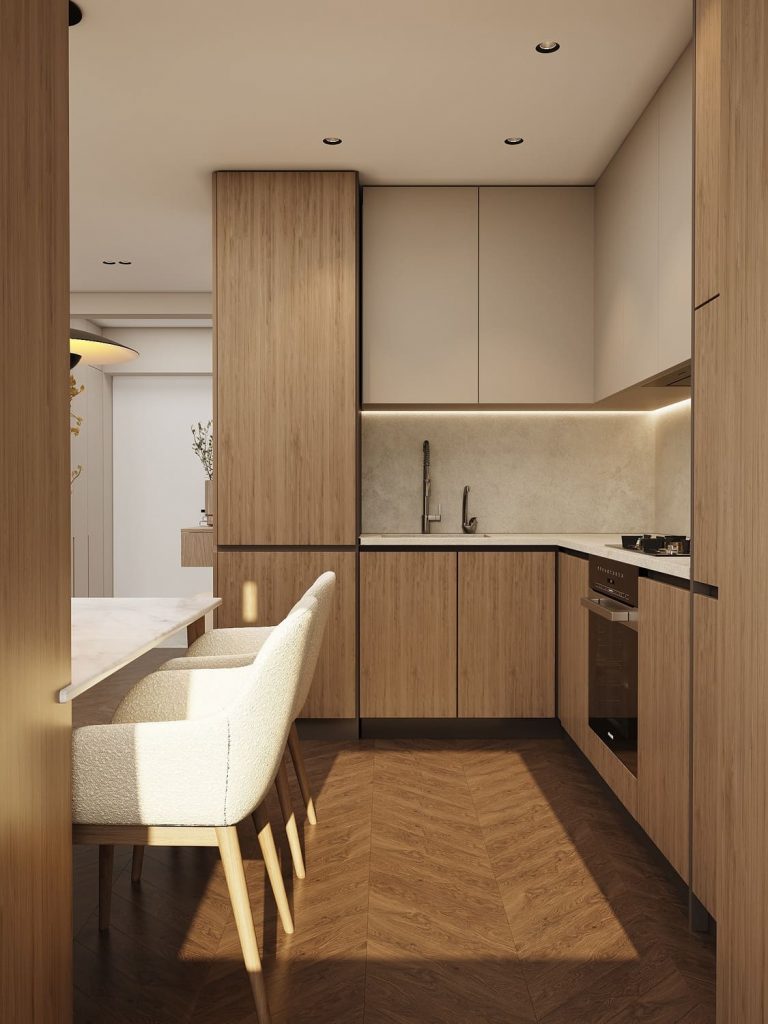 Кухня выполнена в лаконичной L-образной планировке: шкафы до потолка, продуманное хранение и скрытая техника. Рабочая зона подсвечена тёплым светом, а материалы выбраны практичные и долговечные. Благодаря нейтральным фасадам кухня не выбивается из общей композиции, оставаясь частью единого пространства.
