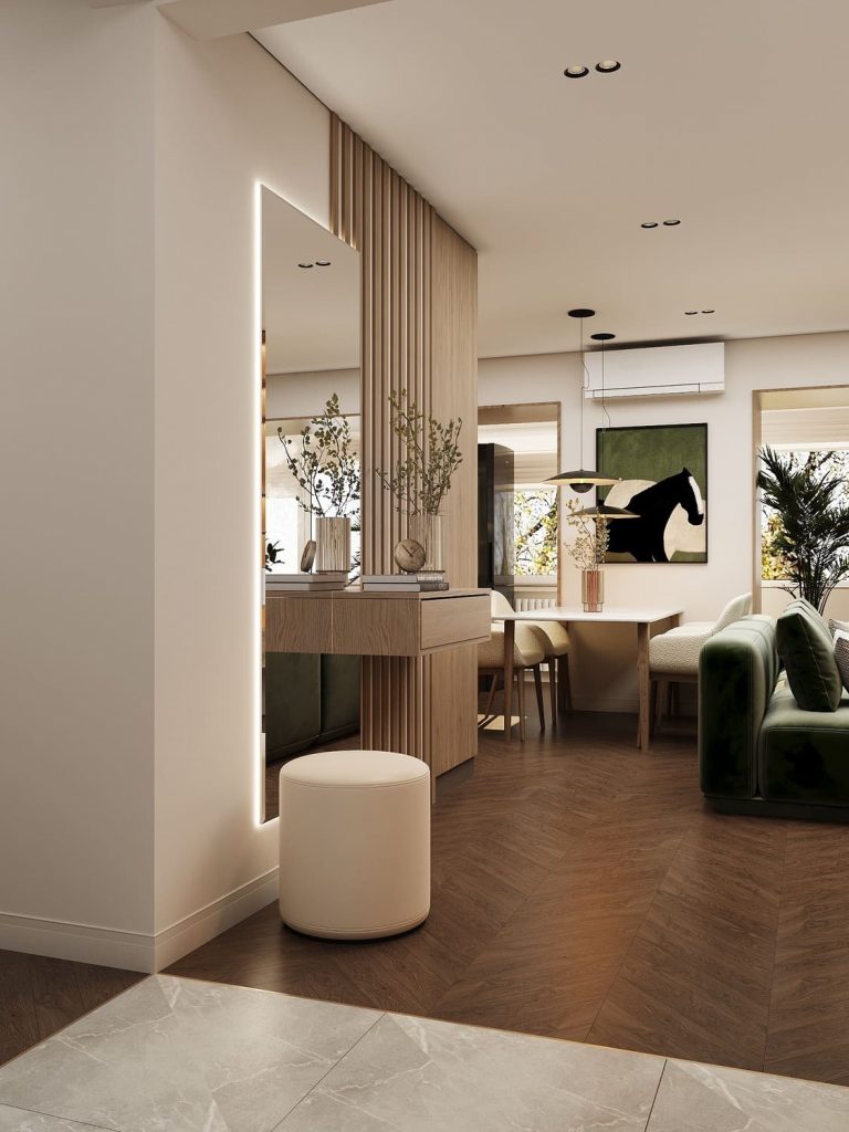 Зеркало с подсветкой и декоративная консоль с вертикальными рейками завершают композицию, делая прихожую функциональной и стильной.
