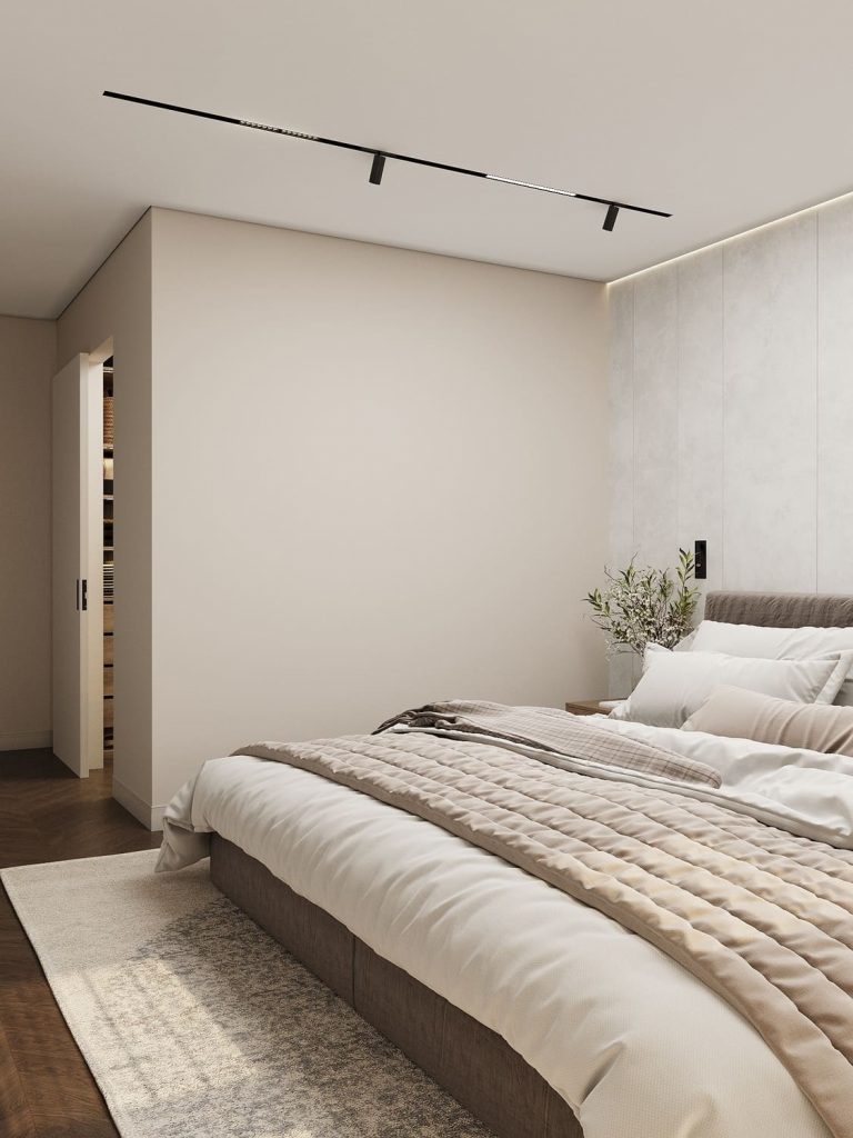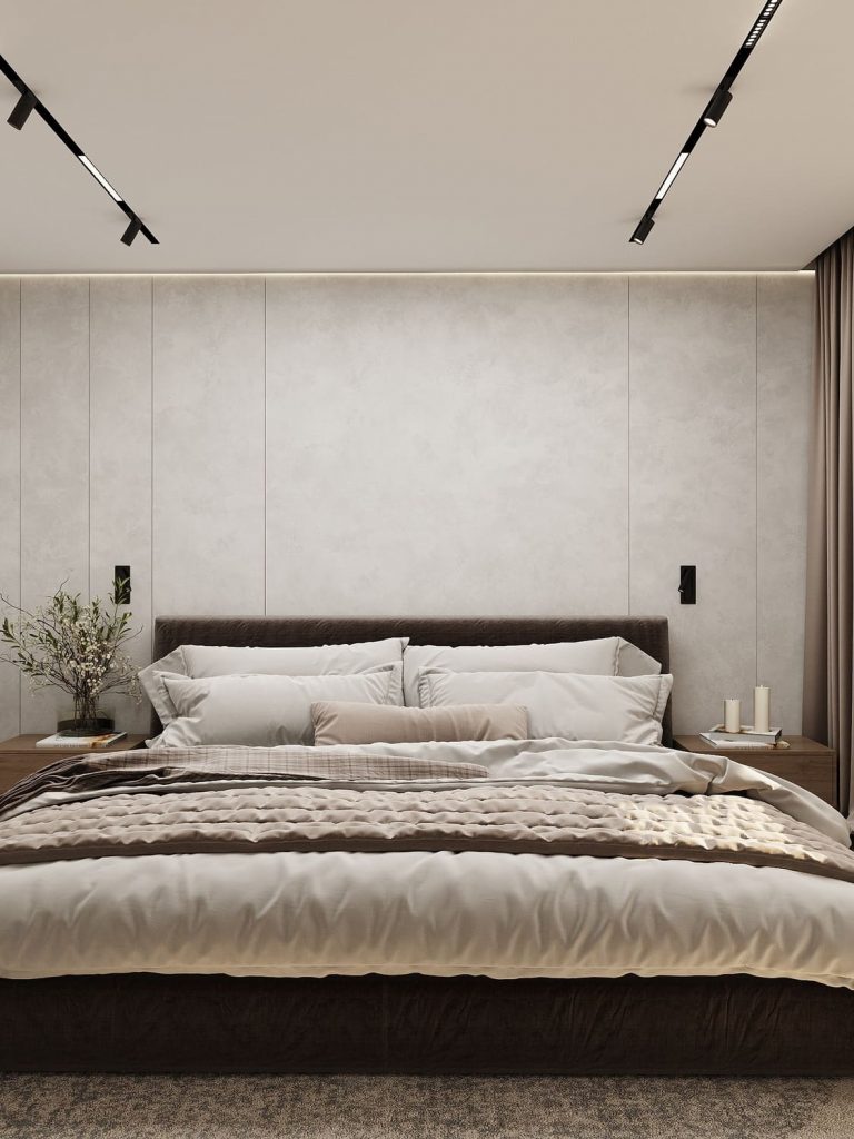 Лаконичные прикроватные тумбы поддерживают минимализм интерьера, а трековые светильники позволяют регулировать освещение под настроение.