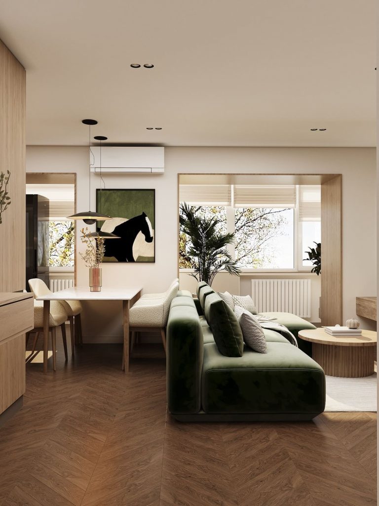 Интерьер выдержан в светлой нейтральной гамме с тёплыми деревянными акцентами и глубоким зелёным цветом — он добавляет жизни и природного спокойствия.