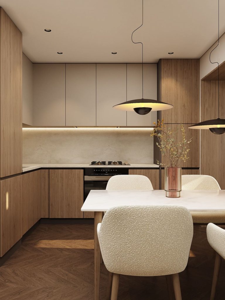 Мебель и отделка построены на сочетании фактур: гладкие фасады кухни, текстура дерева и мягкий бархат дивана. Над обеденной зоной — лаконичные светильники, которые задают ритм пространству и мягко делят его на функциональные части.