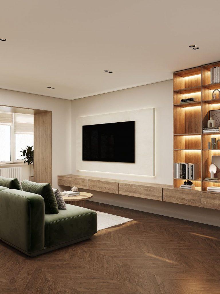 Телевизионная зона решена максимально чисто: подвесная тумба, аккуратная подсветка, стеллаж из тёплого дерева с рассеянным светом.