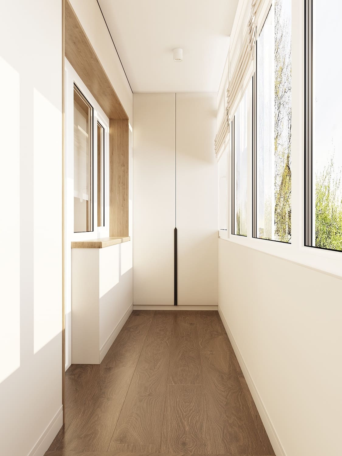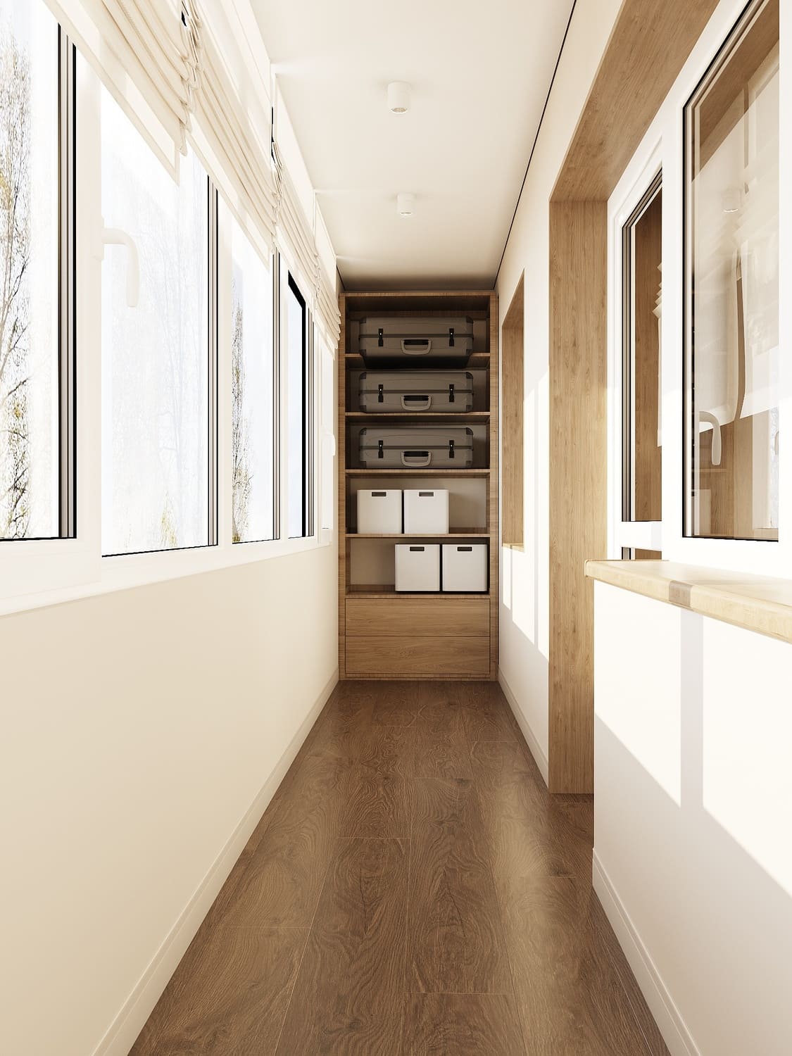 Здесь предусмотрено удобное хранение — встроенный шкаф и открытые полки для сезонных вещей, чемоданов и бытовых мелочей. Благодаря тёплой отделке деревом и большим окнам пространство наполнено светом и выглядит уютно даже в пасмурные дни. Белые римские шторы регулируют уровень освещённости и добавляют уюта, а нейтральная палитра делает балкон универсальным: его можно использовать как зону отдыха, мини-мастерскую или просто место для утреннего кофе.