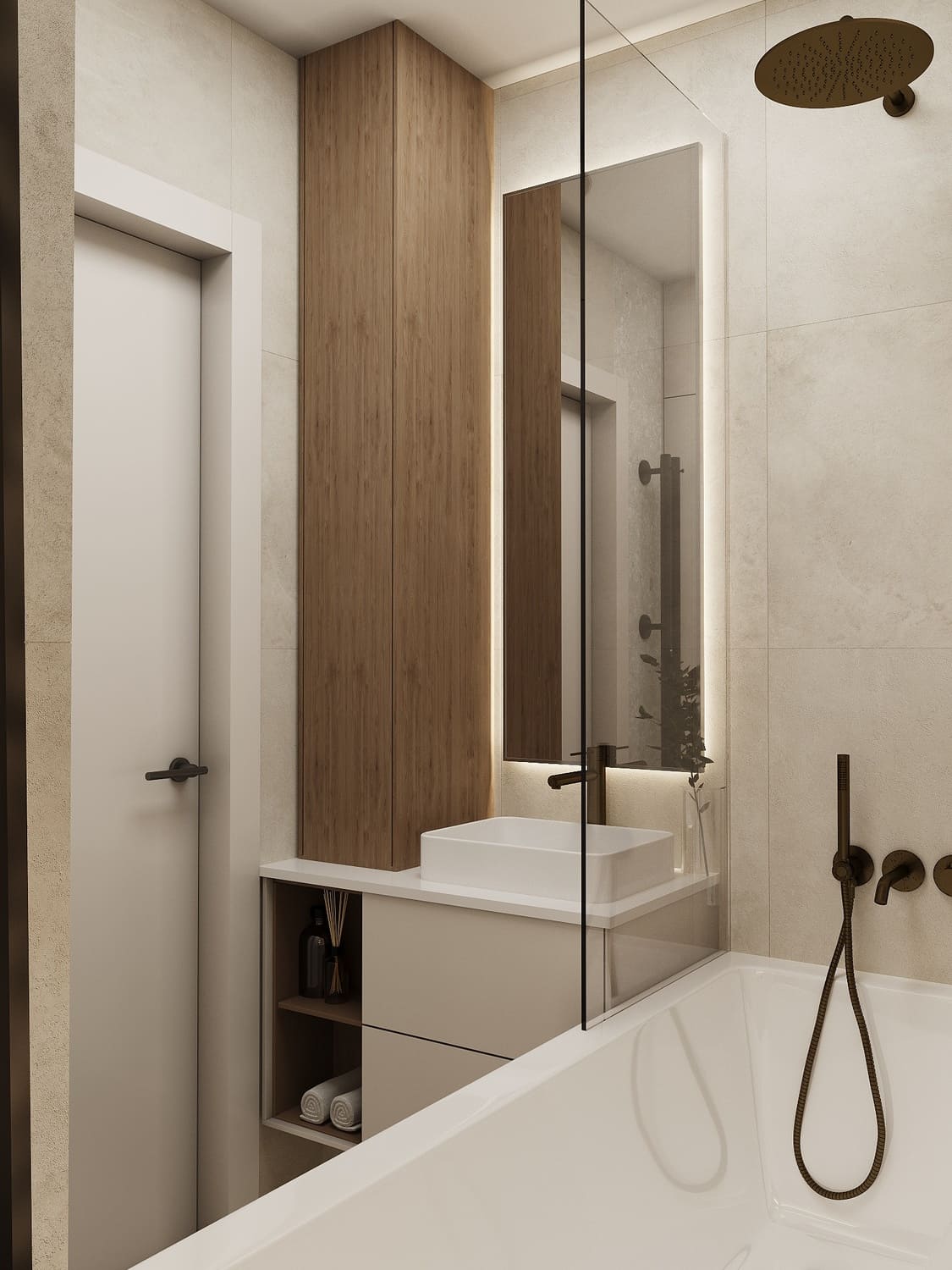 Зона ванны выполнена с акцентом на функциональность и эстетику: встроенные ниши с подсветкой позволяют хранить всё необходимое, а смесители и душ в бронзовом оттенке добавляют интерьеру изысканности.