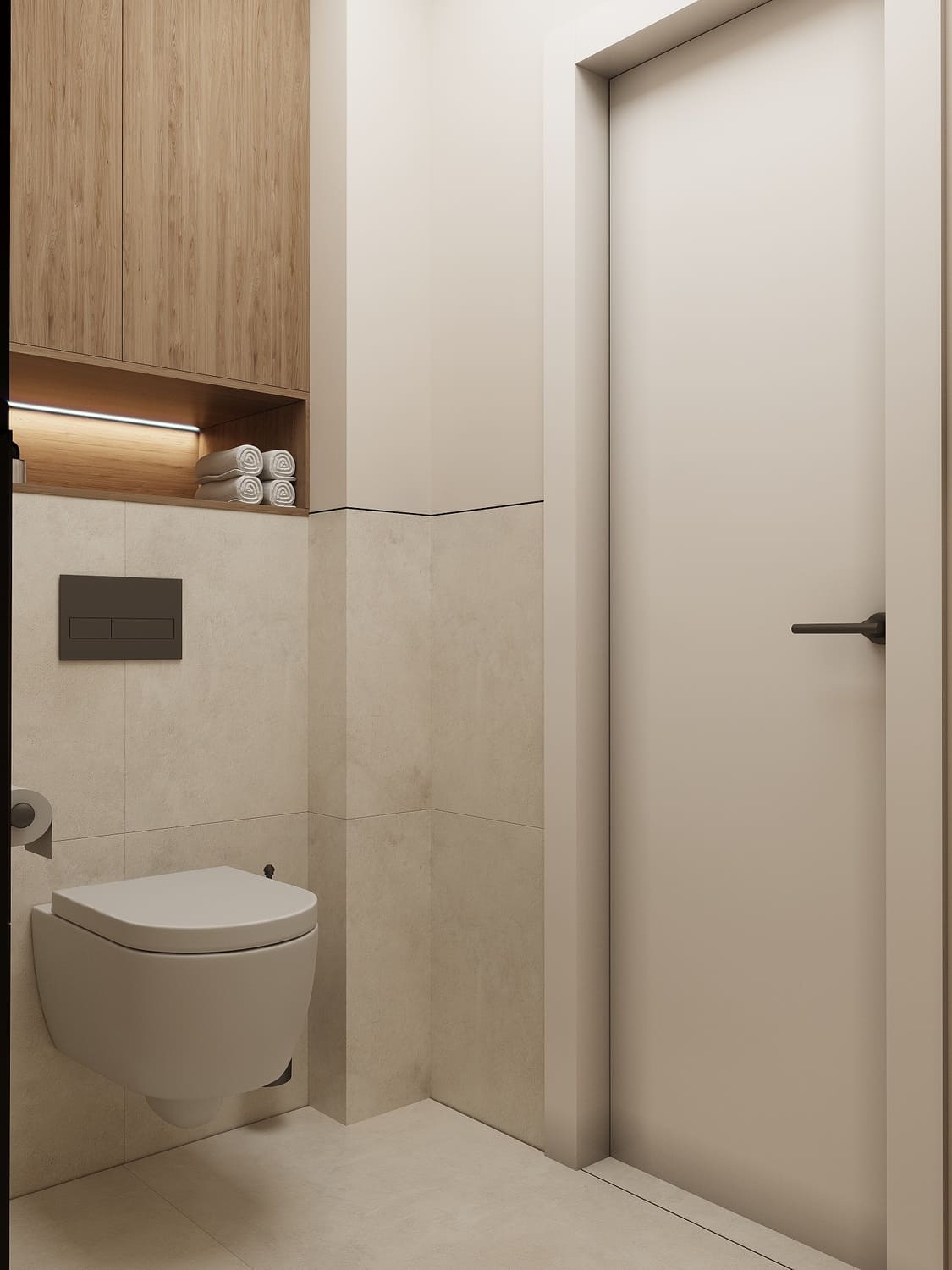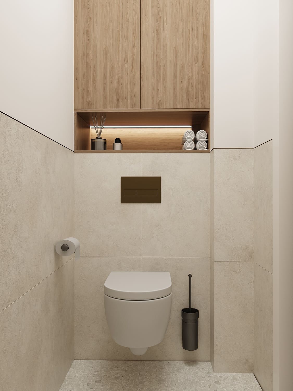 Минимализм в деталях поддержан графичными акцентами — чёрной фурнитурой и кнопкой смыва в бронзовом оттенке. Благодаря этому решение выглядит современно и сбалансировано, а сама комната кажется продуманной до мелочей.