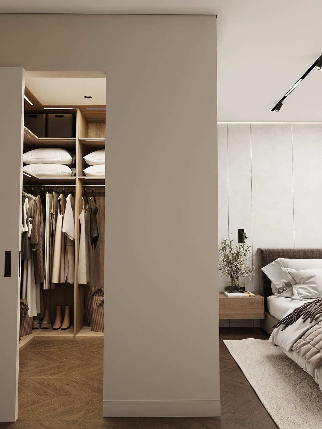 За раздвижной дверью скрывается просторная гардеробная — функциональное продолжение спальни. Здесь предусмотрено всё: от отделений под длинную одежду до открытых полок и выдвижных ящиков. Встроенная подсветка создаёт уютную атмосферу и делает поиск нужных вещей комфортным даже ночью.