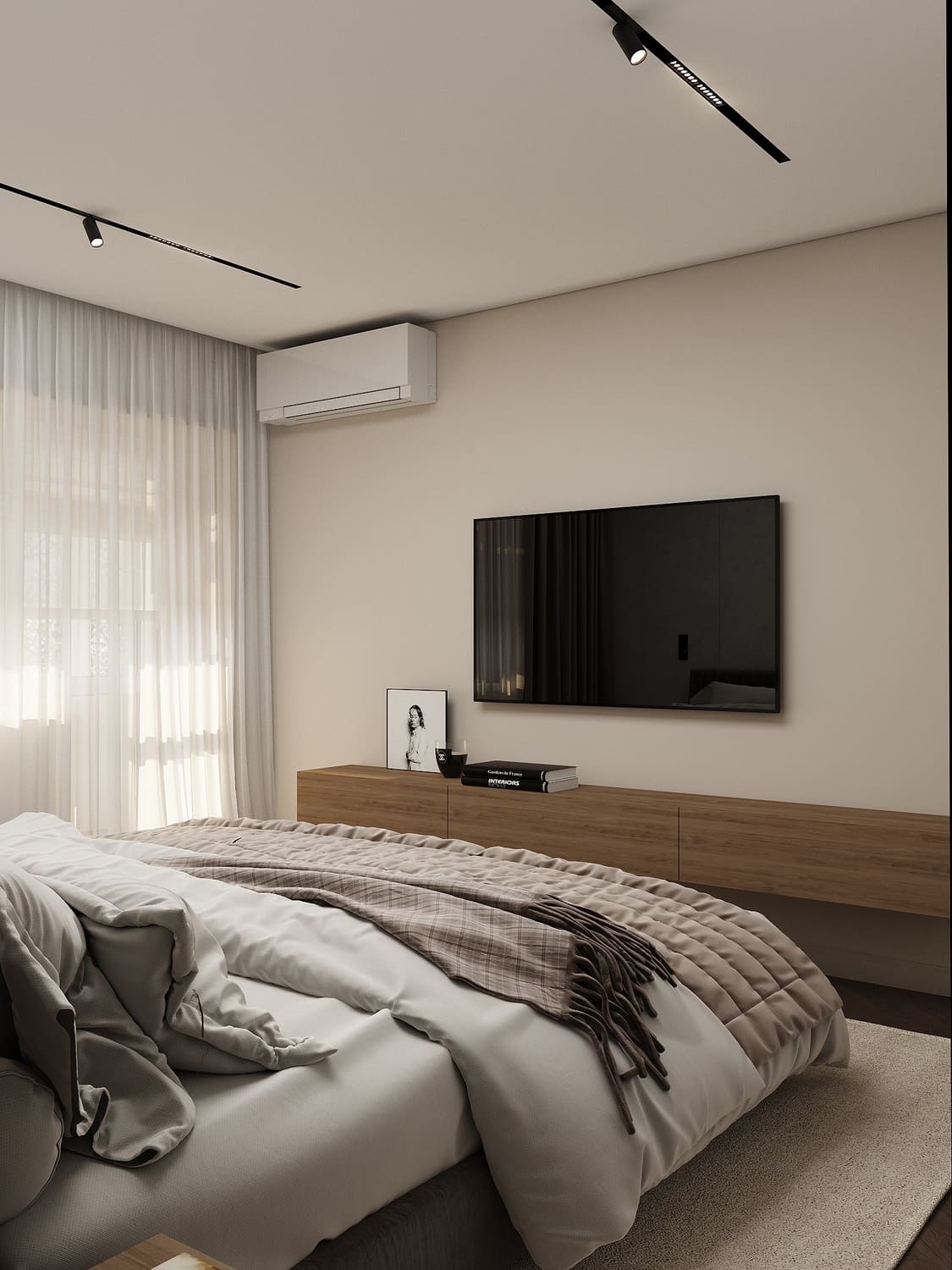 Телевизионная зона оформлена просто и элегантно — подвесная тумба из дерева, пара акцентов в виде книг и фотографии, ничего лишнего. Мягкие шторы и светлый ковер завершают образ, превращая спальню в настоящее место силы, где легко расслабиться.