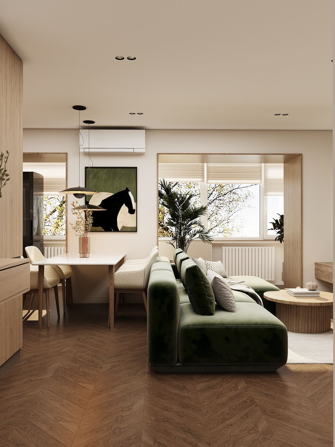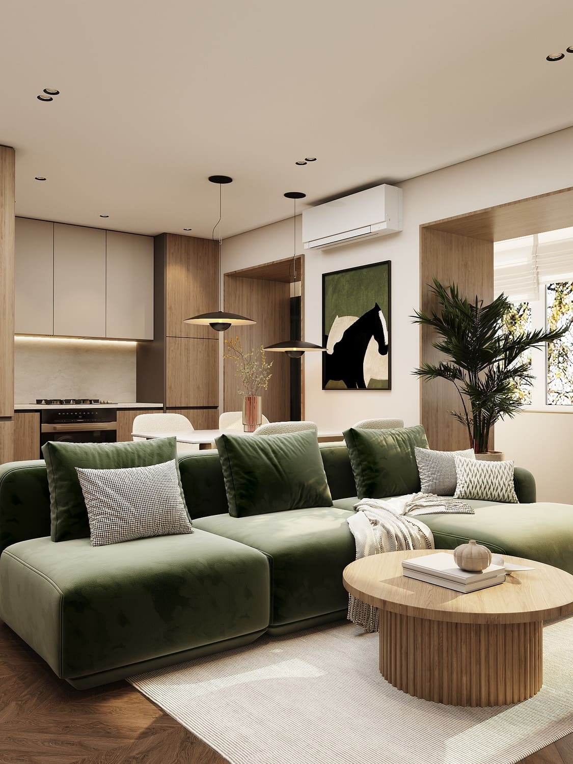 Интерьер выдержан в светлой нейтральной гамме с тёплыми деревянными акцентами и глубоким зелёным цветом — он добавляет жизни и природного спокойствия.