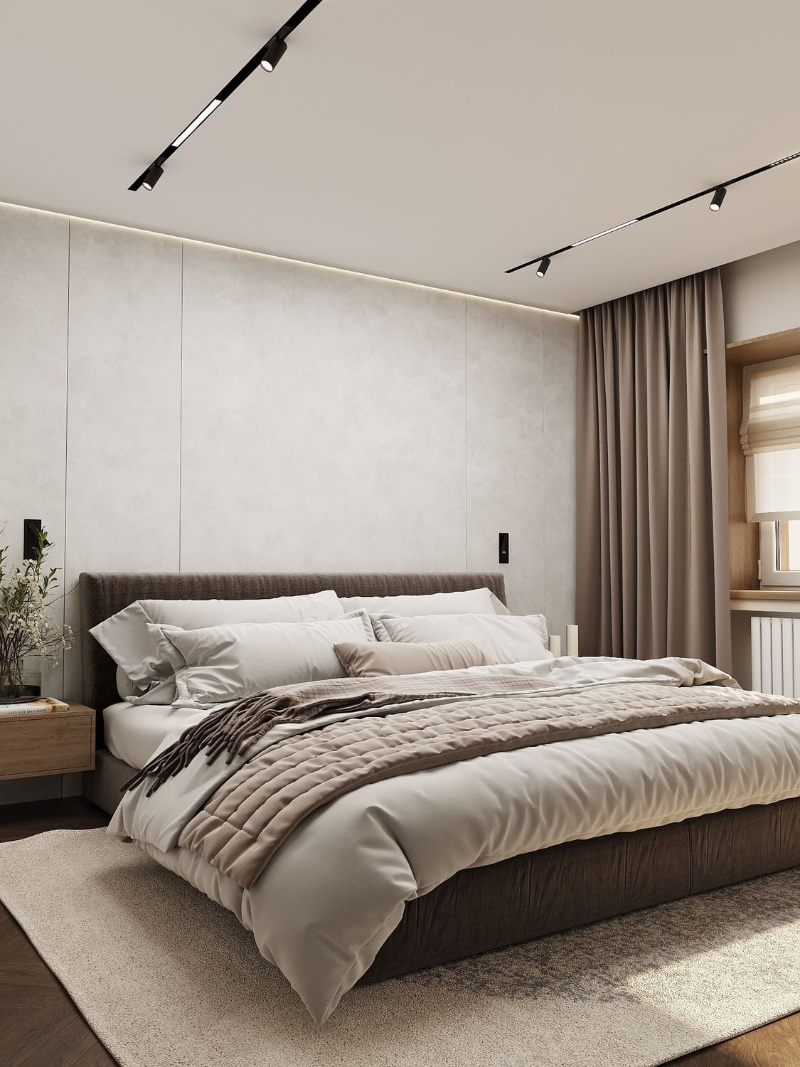 Лаконичные прикроватные тумбы поддерживают минимализм интерьера, а трековые светильники позволяют регулировать освещение под настроение.