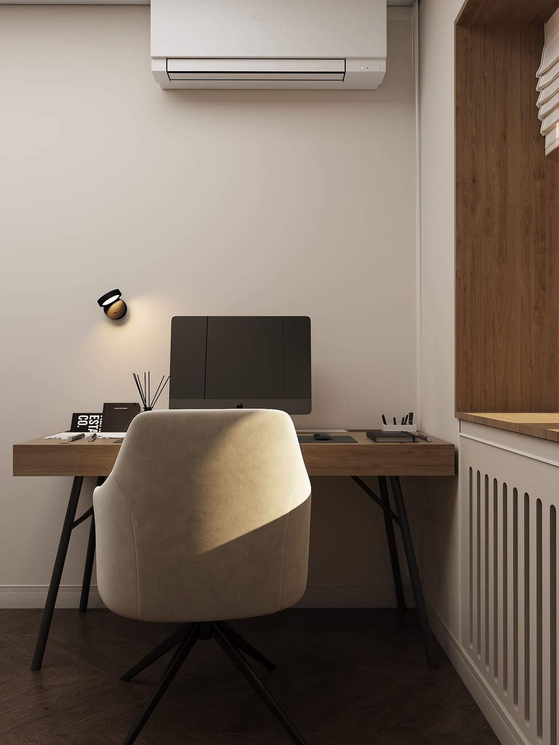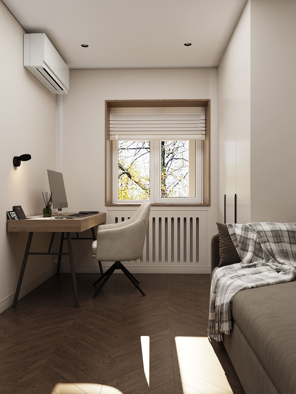 У окна расположено рабочее место — минималистичный стол с тонкой столешницей и удобное кресло в обивке цвета топлёного молока. Свет падает прямо на поверхность, а настенный светильник с регулируемым наклоном добавляет мягкого локального освещения для вечерней работы.