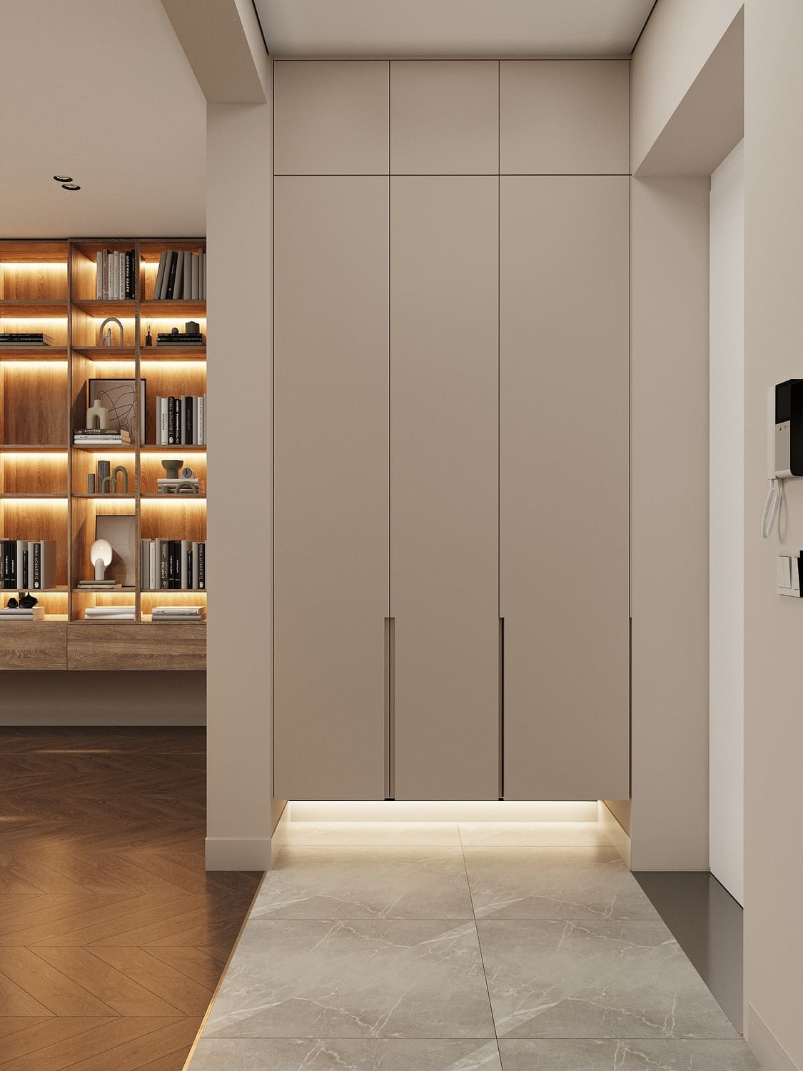 В прихожей размещён высокий шкаф со скрытыми ручками — он прячет в себе всё необходимое: верхнюю одежду, обувь, бытовые мелочи. Благодаря подсветке в нижней части мебель кажется лёгкой и “парящей” над полом, что добавляет воздушности и визуально расширяет пространство.
