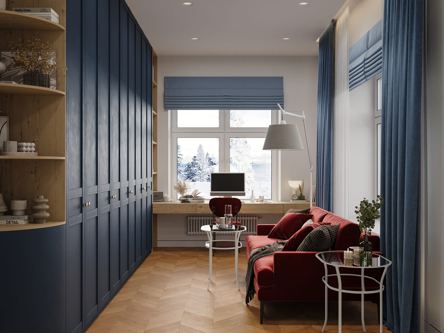 Яркий акцент в комнате — бархатный диван насыщенного винного оттенка. В паре с нейтральными стенами и тёплым деревянным полом он придаёт кабинету характер и превращает его в пространство не только для работы, но и для отдыха. Здесь можно сесть с книгой или устроить короткий перерыв в течение дня.