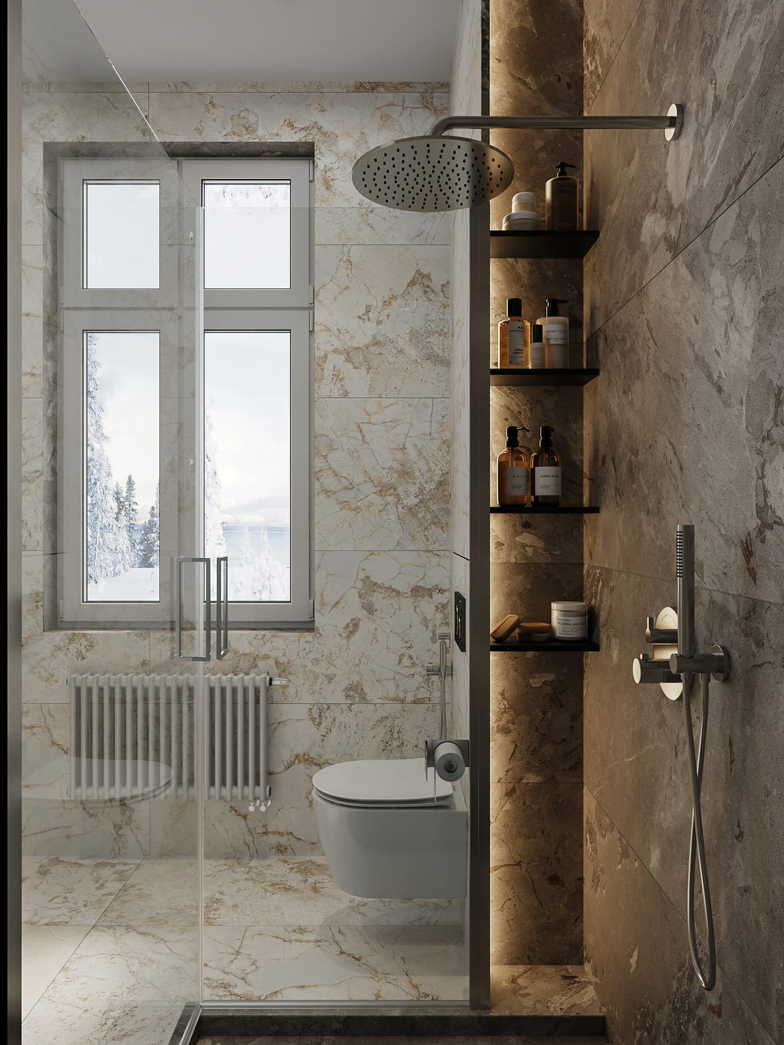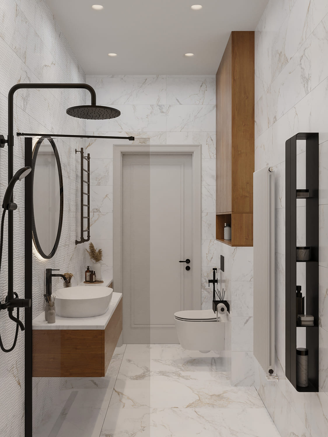 Основной фон создаёт плитка под белый мрамор с деликатными прожилками, которая делает пространство визуально светлым и просторным.