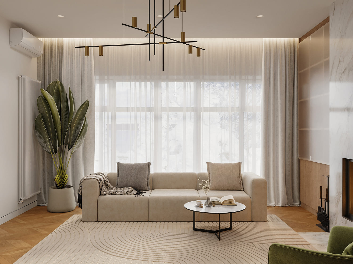 Мягкий свет от больших панорамных окон днём и огонь в камине вечером формируют ощущение спокойствия и уединённости. Интерьер выдержан в светлых, нейтральных тонах, но акцентные кресла насыщенного зелёного оттенка добавляют живой характер и свежесть.
