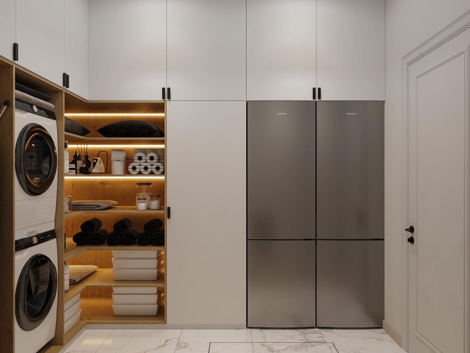 Функциональная постирочная стала незаменимым помощником в повседневной жизни хозяев дома. Здесь всё продумано до мелочей: компактно встроенные стиральная и сушильная машины, вместительные закрытые шкафы и удобные открытые полки с подсветкой. Встроенное хранение позволяет разместить как бытовую химию, так и корзины для белья, подушки, полотенца и мелкие аксессуары. Лаконичные фасады белого цвета сочетаются с тёплыми деревянными вставками, а подсветка делает интерьер уютным и подчёркивает порядок.