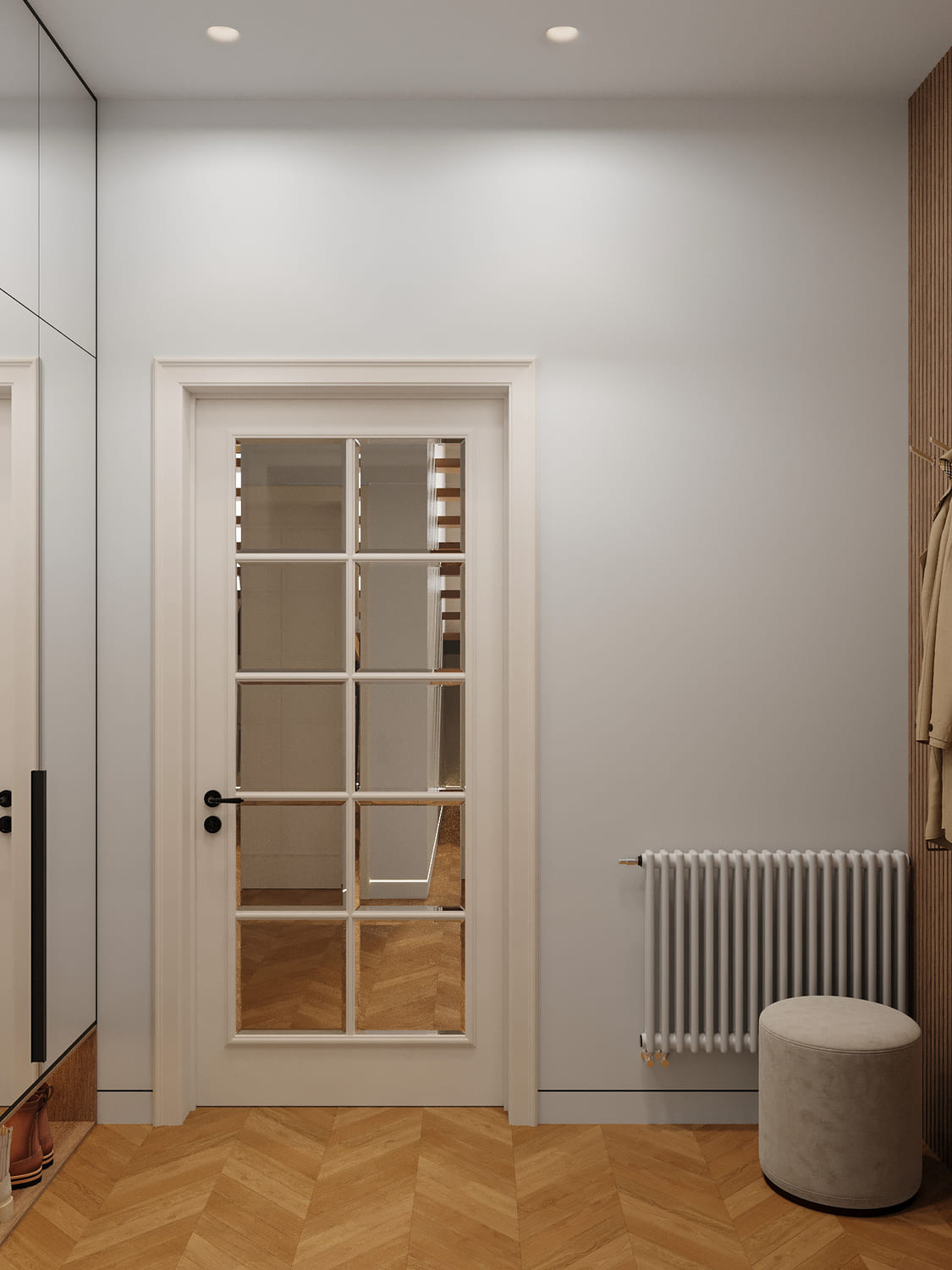 Стена, отделанная деревянными панелями с тонкими вертикальными линиями, добавляет уюта и подчёркивает общий характер интерьера. Напротив — мягкий пуф и консоль, которые делают прихожую не только функциональной, но и уютной.