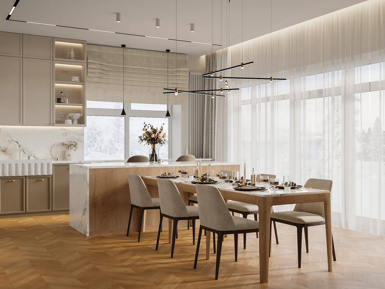 Кухонный остров объединяет функции: с одной стороны — удобная рабочая поверхность, с другой — зона хранения и барные места для завтрака. Рядом расположен большой обеденный стол, который идеально подходит и для ежедневных ужинов, и для праздничных встреч.